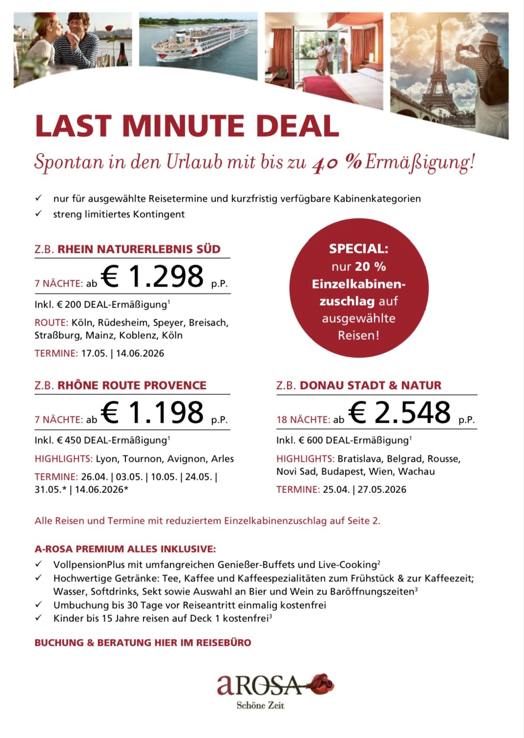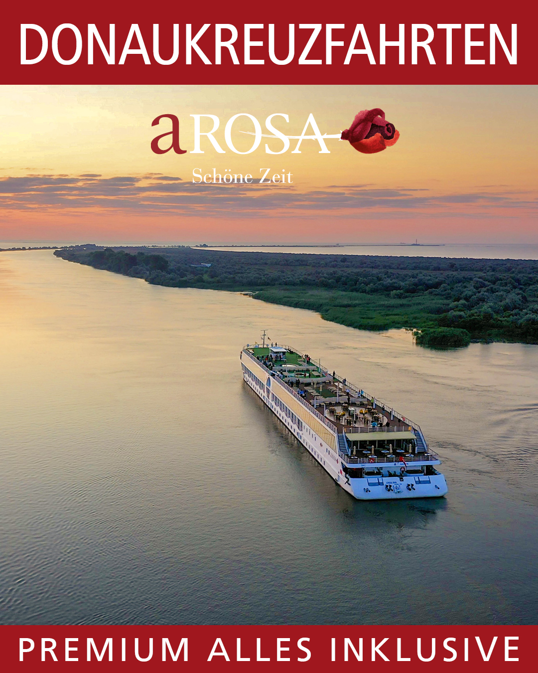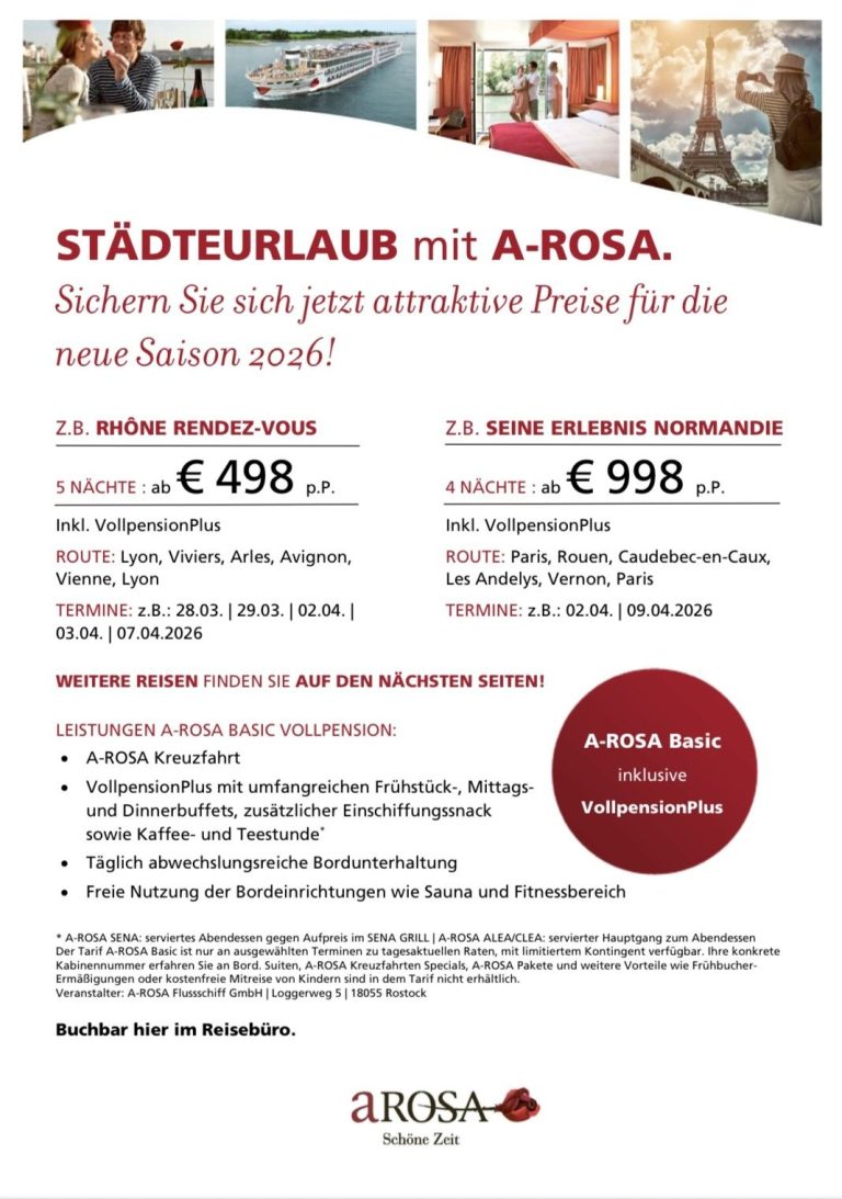 Egal ob für Abenteuerlustige oder Erholungssuchende – A-ROSA Flusskreuzfahrten erfüllen alle Wünsche und versprechen eine unvergessliche Reise.