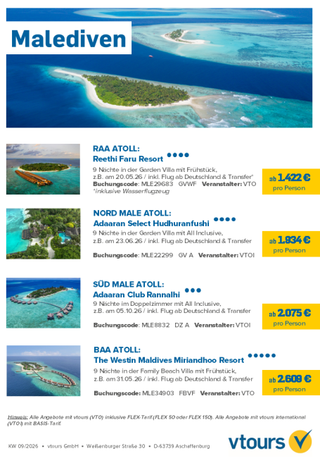 Die Malediven sind ein wahres Paradies für Reisende, die nach traumhaften Hotels und unberührter Natur suchen. In unserem Reisebüro bieten wir Ihnen die besten Angebote für luxuriöse Unterkünfte mit atemberaubendem Blick auf das kristallklare Wasser. Genießen Sie aktive Urlaubsabenteuer wie Schnorcheln, Tauchen und Wassersport in einer der schönsten Unterwasserwelten der Erde. Zudem verwöhnen wir Sie mit exklusiven kulinarischen Erlebnissen, wo Sie die köstliche maledivische Cuisine und internationale Gerichte in erstklassigen Restaurants probieren können. Lassen Sie sich von der Schönheit der Malediven verzaubern!